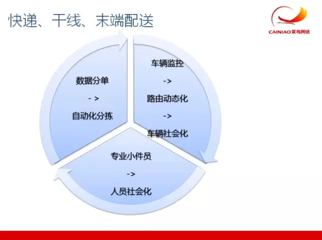 菜鳥今天的定位是“三網(wǎng)兩刀”,一邊是跟著國際化一起的跨境,一邊是農(nóng)村物流。我們希望未來所有的通過數(shù)據(jù)庫的方式穿在一起,這是我們今天實際在做的事情。