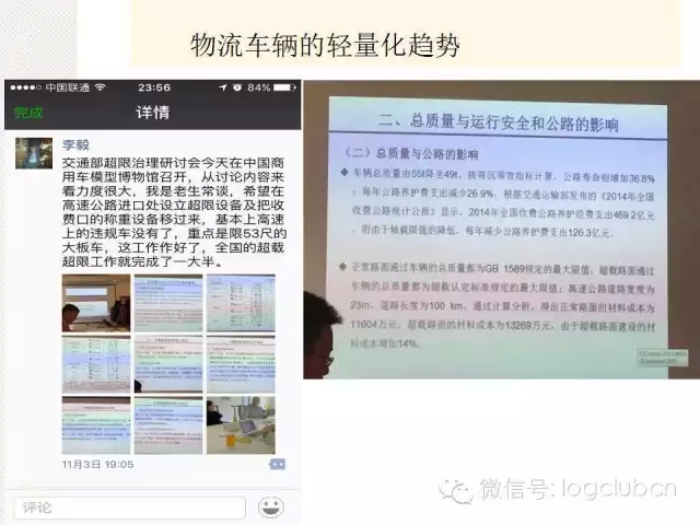這個(gè)圖片我做的比較匆忙,左邊的圖片我相信有很多朋友可能也有他的微信,交通部超限治理研討會于11月1日在上海這邊召開,會議內(nèi)指出原來我們整個(gè)超載這塊,包括GB1589本身出來以后,實(shí)際在執(zhí)行的還是比較松,該超載超載,該超限超限。但實(shí)際上這個(gè)會議上非常清楚地提到了一點(diǎn),車輛的總質(zhì)量由55噸下降到49噸,整個(gè)從國家利益上來說,整個(gè)他們在基礎(chǔ)的公路養(yǎng)護(hù)成本這一塊就下降了120幾個(gè)億,當(dāng)然這只是一個(gè)毛估的數(shù)字。從安全性能來說,幾個(gè)大的物流公司也發(fā)生過幾起事件,像自燃,車禍,雖然有一臺兩臺車,但是對這幾家公司影響還是比較大。就車輛安全性角度上來說,也是把超限、超載這塊提上了日程的原因。