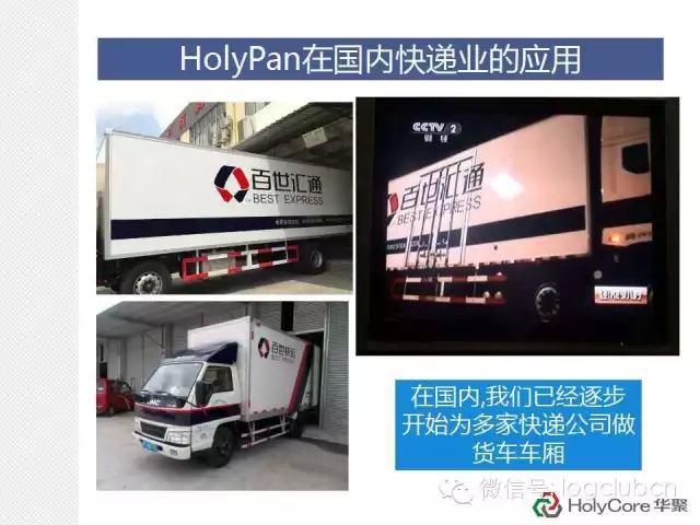 這款車是華立集團(tuán)下面的一家電動車,結(jié)合了我們的輕量化板材,優(yōu)勢明顯、市場反應(yīng)很好,今年已經(jīng)超過1000臺。從這引申到國內(nèi)眾多的新能源車廂上去,我們也都在給他們做相應(yīng)配套,輕量化貨廂對新能源車來說是最合適的,從根本能夠提高車輛的續(xù)航里程。另外香港順豐、聯(lián)邦快遞也選用我們輕量化華聚板制作的車廂作為車輛標(biāo)準(zhǔn)配置,同時(shí)我們也配合解放、福田等主機(jī)廠完成了國內(nèi)順豐樣車的制作。目前來說,包括中國郵政和國內(nèi)起示范作用的幾家快遞物流我們基本上都切入進(jìn)去了,做了相應(yīng)的配套。整個(gè)郵政系統(tǒng)想改變他們的習(xí)慣,改變他們的標(biāo)準(zhǔn)是非常困難的,這幾張圖片是郵政貴陽地區(qū)的批量化車廂,我們也是從節(jié)能減排這幾個(gè)字真正能夠打動的他們。這些圖片是2013年在武漢商務(wù)車展上我們跟中集通華一起展出的翼展車,14米多的翼展,這幾年也陸陸續(xù)續(xù)開發(fā)了很多款16.5米和17.5米的集裝箱輕量化車廂。這個(gè)是在英國皇家郵政的用車,18米的掛車,跟他原來的木板結(jié)構(gòu)相比較,我們整個(gè)車廂輕了接近2噸,因?yàn)榇蠹叶际歉氵\(yùn)營的,這一塊的帳還是比較清晰的。