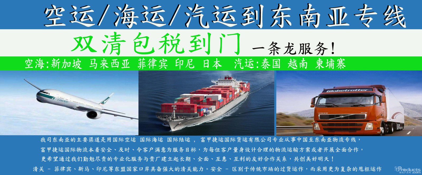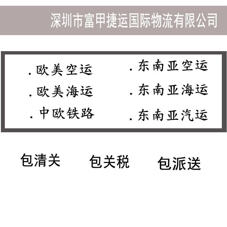 富甲捷運是國家有關(guān)部門批準專業(yè)經(jīng)營國際運輸業(yè)務(wù).公司成立2010年,近10來年公司一直主營東亞南亞專線,有豐富的操作經(jīng)驗,我司主要提供歐美空運專線/歐美海運包稅專線/東南亞空海陸聯(lián)運門到門服務(wù).我司現(xiàn)在操作員/客服員/司機等80多號人,達成從提貨到當?shù)睾炇找粭l龍服務(wù)!安全可靠放心,迎來了國內(nèi)外廣大客戶的好評.我司與多個空運公司,船運公司包倉合作,倉位充足,服務(wù)至上!公司主要做歐美專線(歐洲空運專線/歐洲海運專線/歐洲鐵路專線/美國空運專線/美國海運專線)東南亞專線(新加坡空海運專線/馬來西亞空海運專線/菲律賓空海運專線/印尼空海運專線/日本空運海運專線/泰國空陸運專線/越南空陸運專線/柬埔寨空陸運專線)。公司對運輸產(chǎn)品較廣,鞋子,服裝,包包,電池,手機,玩具,廚具,家用電器,生活用品等都是包清關(guān)包稅到派送到門! 深圳市富甲捷運國際物流有限公司高覆蓋、高效率的服務(wù)獲得多家公司和機構(gòu)的認可。深圳市富甲捷運國際物流有限公司將以最專業(yè)的精神為您提供安全、經(jīng)濟、專業(yè)的服務(wù)。 您的貨物安全到達,是我們的使命!