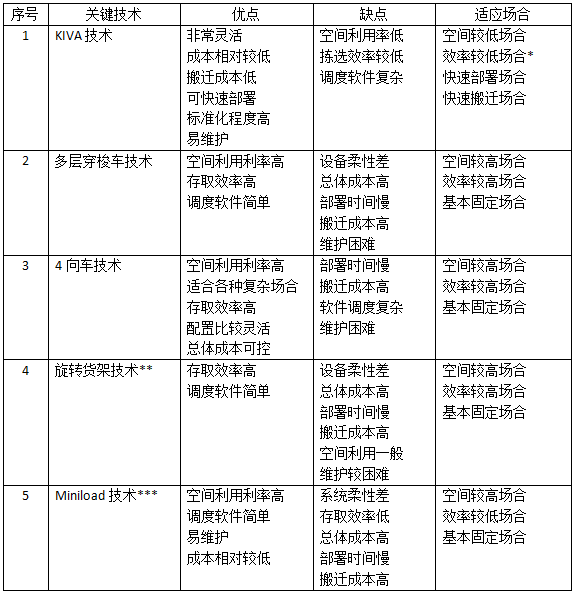 如果要細(xì)分貨到人揀選系統(tǒng)的技術(shù),主要在于快速存取技術(shù)和揀選工作站技術(shù)。有關(guān)這一方面的內(nèi)容很多,目前市面上流行的存取技術(shù)有數(shù)十種之多,本文僅對(duì)幾種常用的存取技術(shù)進(jìn)行對(duì)比分析。如下表所示: