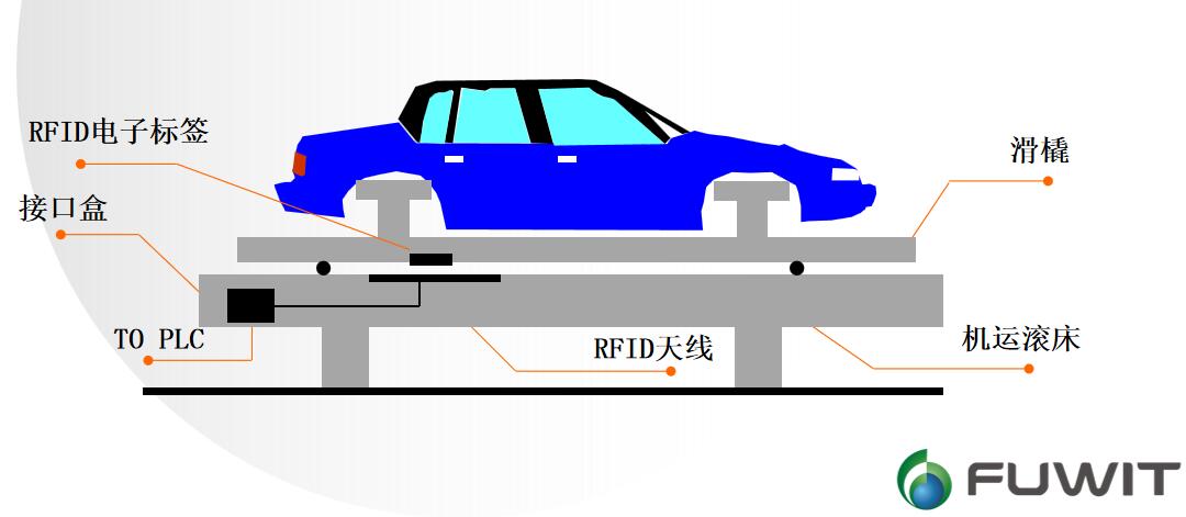 涂裝車間主要是運(yùn)輸車體的滑橇上安裝電子標(biāo)簽,車體在被放到滑橇上的時(shí)候會(huì)完成車體信息的錄入,在車間關(guān)鍵位置的機(jī)運(yùn)滾床上部署RFID讀取節(jié)點(diǎn),滑橇在將車體運(yùn)輸?shù)疥P(guān)鍵位置后,讀取設(shè)備會(huì)讀取到滑橇上的電子標(biāo)簽信息,從而來(lái)定位車體的身份信息,并將信息傳輸給PLC,來(lái)指導(dǎo)完成相關(guān)作業(yè)。
