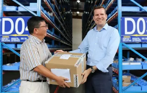 啟動(dòng)儀式上,暢聯(lián)物流總裁徐峰先生帶領(lǐng)永恒力一行參觀(guān)了分撥中心并作了簡(jiǎn)要介紹。隨后,永恒力亞太區(qū)零配件分撥中心工作人員完成了一系列訂單檢索、分揀貨物、掃描、打包等訂單處理流程后,徐總將永恒力分撥中心的第一個(gè)包裹親手交到Markus Zoller先生手上。由此,永恒力亞太區(qū)零配件分撥中心正式啟用,將服務(wù)于永恒力亞太地區(qū)所有的銷(xiāo)售機(jī)構(gòu)和渠道。
