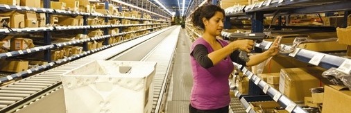 配送中心每天可處理5,000-8,000箱貨品。而在9月中旬到11月底這段最高峰時(shí)期,配送中心每天則要處理12000多箱貨品。附加處理量中有很多來自網(wǎng)絡(luò)直銷訂單,一般都屬單一品規(guī)。