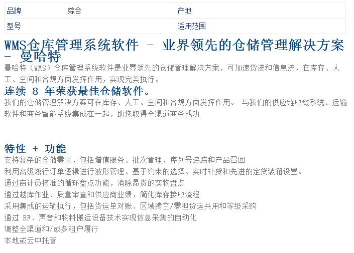 曼哈頓倉(cāng)儲(chǔ)管理系統(tǒng)(WMS)是業(yè)界領(lǐng)先的解決方案,提供了最先進(jìn)的物流技術(shù),能實(shí)現(xiàn)較高投資回報(bào)率并提高庫(kù)存、人力、物理空間、時(shí)間和成本等方面的效益。 曼哈頓倉(cāng)儲(chǔ)管理系統(tǒng)(WMS)跳出揀貨、包裝和裝貨的基本框架,采用先進(jìn)的數(shù)學(xué)算法,組織和優(yōu)化倉(cāng)庫(kù)運(yùn)作,從而將倉(cāng)庫(kù)物流轉(zhuǎn)變?yōu)楣?yīng)鏈中的關(guān)鍵戰(zhàn)略組成部分。