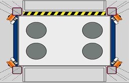 Haenel的垂直升降貨柜利用四側(cè)板為導(dǎo)軌,在小車(chē)上加4個(gè)定位輪,從而更進(jìn)一步保證小車(chē)的平穩(wěn)和位置的準(zhǔn)確。同時(shí)保證了緊湊的結(jié)構(gòu)。下圖為小車(chē)系統(tǒng)的俯視圖。
