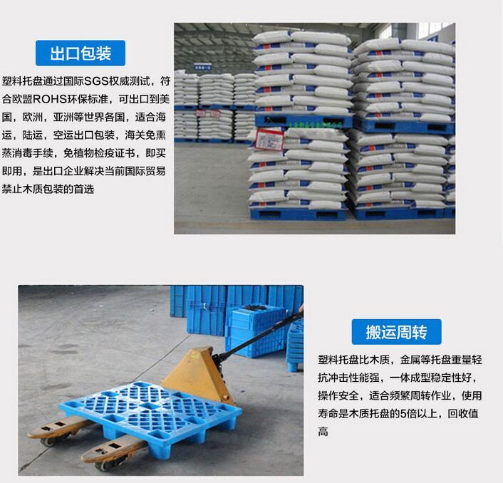 塑料托盤采用全新的高密度聚乙烯(HDPE)注塑成型,托盤相比較木質(zhì)托盤使用壽命是5-7倍,塑料托盤具有質(zhì)量輕,大平面堆碼平穩(wěn),載重大,無釘無刺,無焊無縫,無毒無味,可以更好的保障貨物的安全性,完整性,衛(wèi)生性,保障貨物的不受潮發(fā)霉,不變質(zhì)腐爛,不受污染衛(wèi)生,減少高強(qiáng)度的勞動(dòng)力度,加快貨物的快捷周轉(zhuǎn),便于貨物上下游的完整對接,從塑料托盤整齊平穩(wěn)的堆碼來看,有助于貨物準(zhǔn)確的堆碼數(shù)量