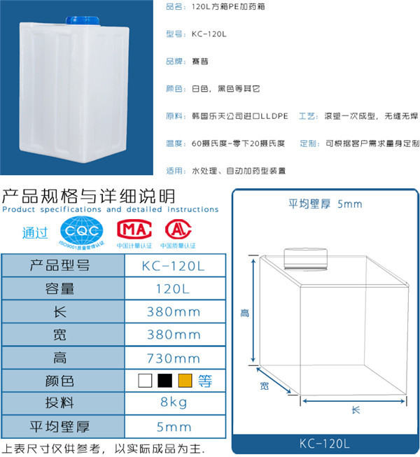 規(guī)格型號(hào):40L-2000L,方形加藥箱有40L,80L,120L,200L,圓柱形加藥箱有40L,100L,200L,300L,500L,1000L,2000L。歡迎來(lái)廠參觀:重慶市江津區(qū)德感工業(yè)園區(qū)。