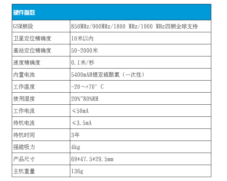 內(nèi)置6000mAH鋰亞硫酰氯一次性電池,每天上報一條位置數(shù)據(jù)可待機時間3年。