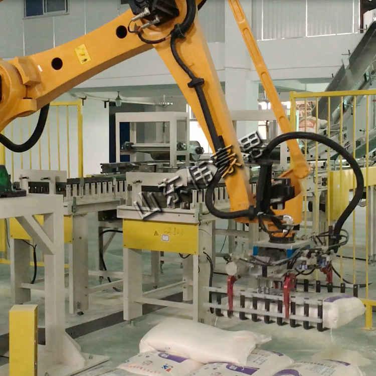 2.機(jī)械手碼垛機(jī)自動化程度高(全自動壓平、全自動轉(zhuǎn)袋、自動供給托盤、全自動分層編組)