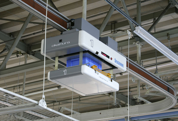 在天井空間中行走的單軌式自動(dòng)搬運(yùn)系統(tǒng)。有效利用空間,地上各工作站間的距離縮短,高速搬運(yùn)成為可能。