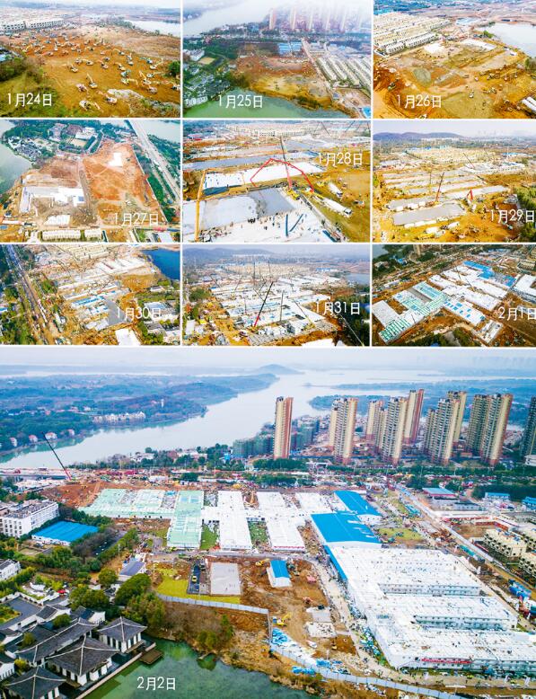 總建筑面積超過3萬平方米,架設(shè)箱式板房近2000間,接診區(qū)病房樓ICU俱全……火神山醫(yī)院從開始設(shè)計到建成完工,歷時10天。圖為標注日期的拼版照片(無人機拍攝)。 新華社記者 肖藝九/攝