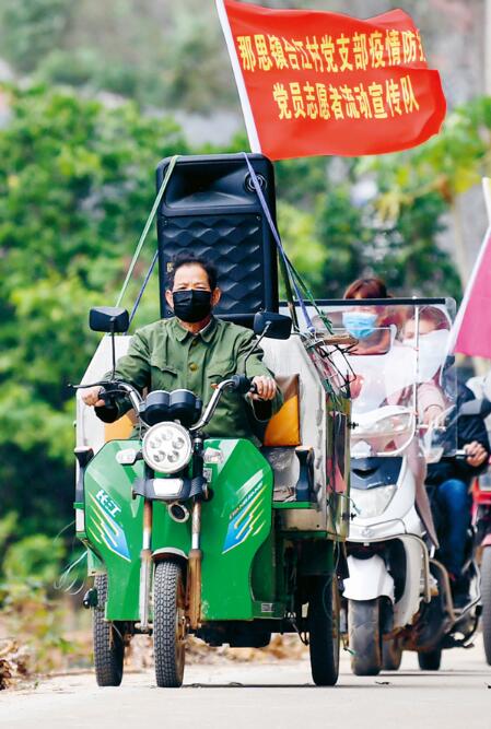 連日來,廣西欽州市構(gòu)建縣、鄉(xiāng)、村三級聯(lián)防聯(lián)控機制,近萬名黨員干部和志愿者奔赴一線,投入到新冠肺炎疫情防控工作中。圖為2月1日欽州市欽南區(qū)那思鎮(zhèn)合江村黨員吳光圍(前)帶領(lǐng)宣傳隊進村宣傳防疫知識。 新華社記者 張愛林/攝