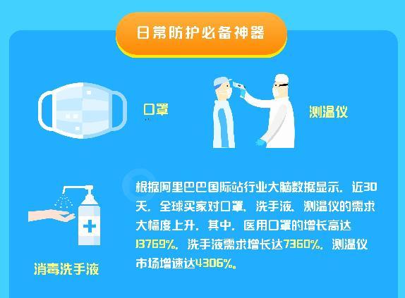 3月3日,21世紀(jì)經(jīng)濟(jì)報道從阿里巴巴國際站獲悉,阿里國際站大數(shù)據(jù)顯示,近30天,全球買家對口罩、消毒洗手液、測溫儀等疫情相關(guān)產(chǎn)品的購買意愿大幅提升,其中,醫(yī)用口罩買家需求近一月環(huán)比增長13769%,洗手液需求環(huán)比增長7360%,測溫儀市場需求環(huán)比增長4306%。