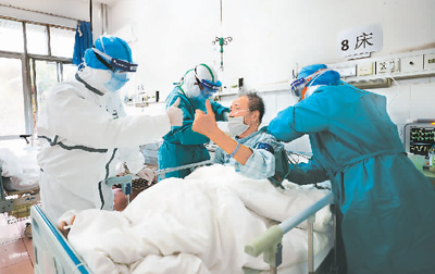 圖為中部戰(zhàn)區(qū)總醫(yī)院感染科重癥ICU病房?jī)?nèi),解放軍總醫(yī)院專家和醫(yī)護(hù)人員共同救治新冠肺炎患者。鮮 敢 王皓宇攝