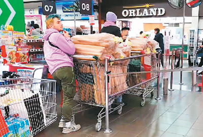 在法國當(dāng)?shù)爻袃?nèi),能見到購買大量法棍的居民?! 。ㄊ茉L者供圖)