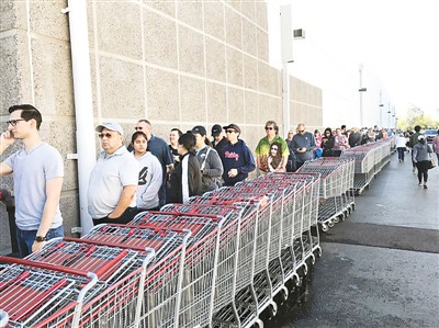 在王翰林所在的洛杉磯工業(yè)市,超市外早已排起了長(zhǎng)隊(duì),市民們?cè)缭缵s來搶購生活物資。而桶裝水、衛(wèi)生紙等熱門商品常常斷貨。在學(xué)校正式停課前,王翰林也已經(jīng)儲(chǔ)備好了足夠的生活用品,做好了打“持久戰(zhàn)”的準(zhǔn)備?! 。ㄊ茉L者供圖)