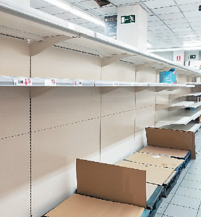 西班牙一家超市內(nèi),貨架近乎已空?! 。ㄊ茉L者供圖)