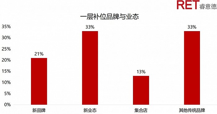 然而近年來誠如前文所言,以快時尚品牌為核心的次主力店軍團也同樣面臨著新舊交替的周期性問題,在《快時尚下場,消費者選了誰來上場補位》一文中,RET睿意德曾分享最新的行業(yè)觀察,新品牌、新業(yè)態(tài)在替代快時尚品牌的過程中,已占到50%以上的比例,而采取其他傳統(tǒng)品牌作為面積消化手段的僅占33%。已充分說明了傳統(tǒng)品牌作為主力店品牌集群的做法正在不被業(yè)界所采納。同時我們也驚喜地發(fā)現(xiàn)了國潮品牌、個性化潮牌在購物中心里扮演的角色日益重要,并且在購物中心一層所占據(jù)的比例呈現(xiàn)出穩(wěn)中有升的氣象。