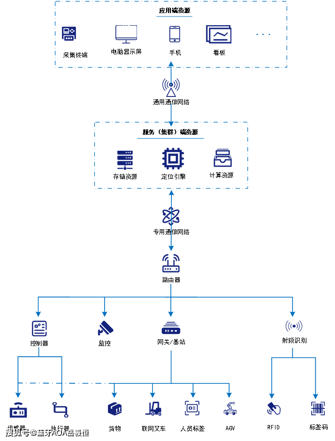 LBS系統(tǒng)的基本架構(gòu)包括感知層、網(wǎng)絡(luò)層、引擎層(支撐層)與應(yīng)用層。感知層涵蓋基本的感知物聯(lián)終端包括由控制器連接的傳感器和執(zhí)行器;定位基站(也可充當(dāng)網(wǎng)關(guān)作用)連接的定位信標(biāo)固定端——貨物、叉車、人員與AGV;射頻識(shí)別終端連接RFID標(biāo)簽或貨物二維碼。網(wǎng)絡(luò)層主要有網(wǎng)絡(luò)中間設(shè)備(路由器、交換機(jī))和網(wǎng)絡(luò)線纜。服務(wù)端資源包括了上端集成計(jì)算服務(wù)器、基礎(chǔ)定位引擎服務(wù)器、存儲(chǔ)服務(wù)器以及服務(wù)器間的連接線纜資源。部分物流倉儲(chǔ)項(xiàng)目需具備遠(yuǎn)端控制與災(zāi)備資源。
