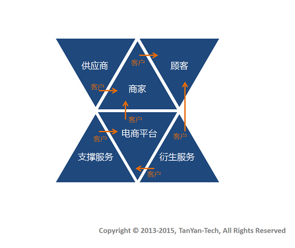 圍繞電商平臺的支撐服務(wù)商提供了例如物流、支付、營銷、會展、媒體等服務(wù),這些服務(wù)都是完成電子商務(wù)閉環(huán)必不可少的,他們的主要客戶是電商平臺。還有些電商產(chǎn)業(yè)鏈上的衍生服務(wù)商,象如店鋪裝修、代運營、搜索比價,他們的客戶一般是網(wǎng)購顧客,也可能是電商平臺。